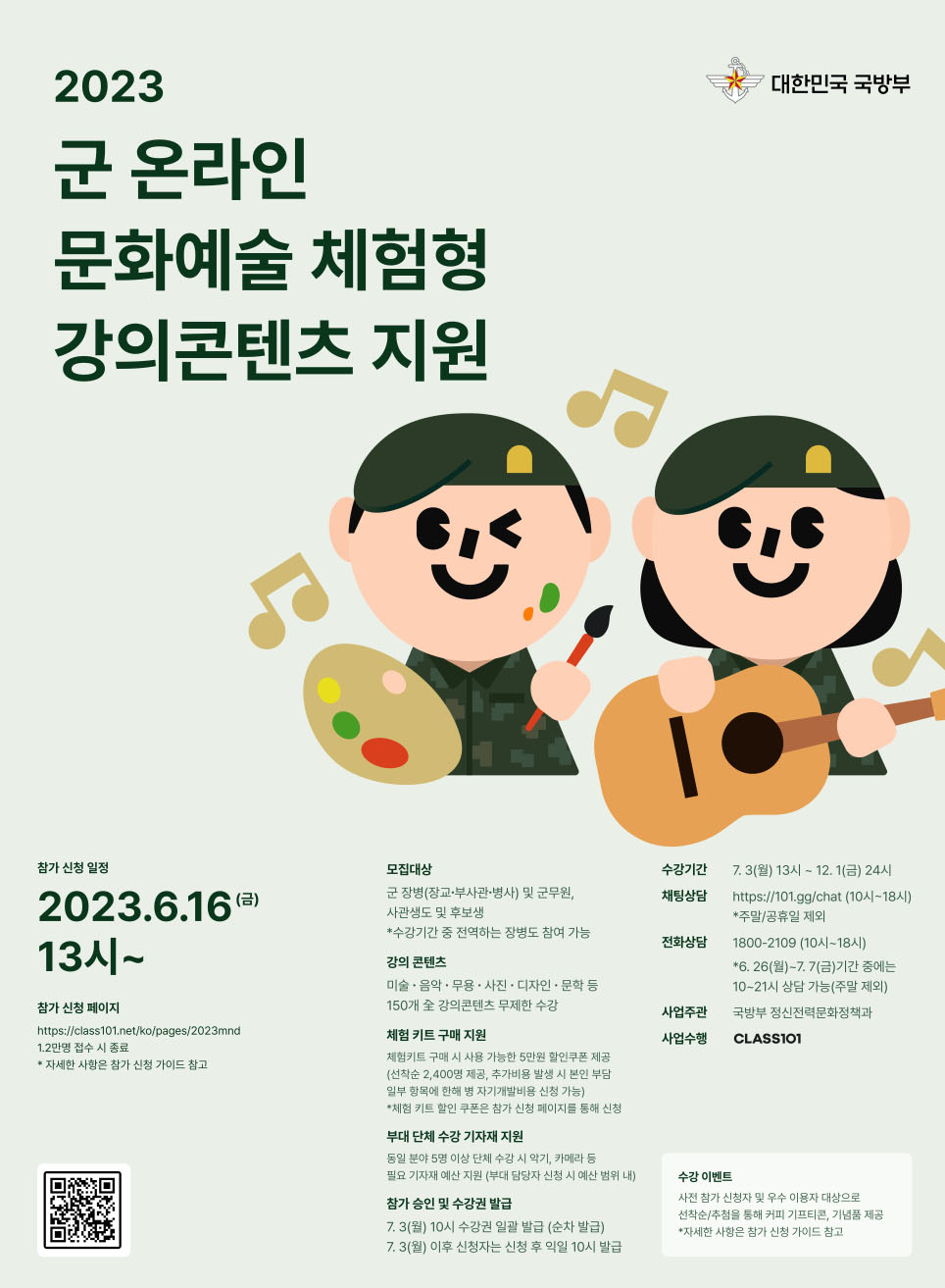 군 장병(장교, 부사관, 병사) 및 군무원, 사관생도 및 후보생을 대상으로 하는 온라인 강의 콘텐츠 수강 지원을 통해 클래스 101 강의를 수강할 수 있습니다