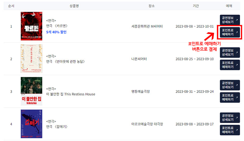 공연 예매 시에는 반드시 [포인트로 예매하기] 버튼을 클릭, 신한카드 결제 선택 후 포인트를 사용해야 합니다