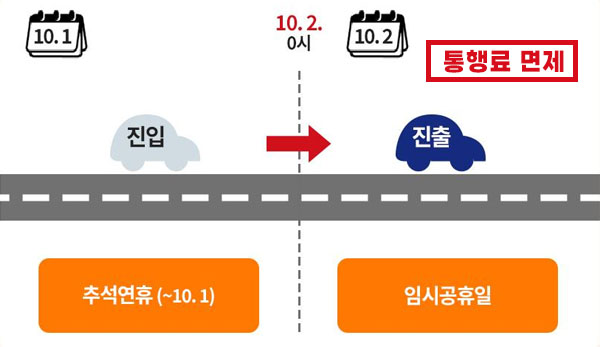 하지만, 추석 연휴 고속도로 통행료 면제 기간은 9월 28일부터 10월 1일까지 4일간이며, 10월 2~3일은 정상 요금을 수납하므로 정확히 알아두시는 것이 좋을 것 같습니다
