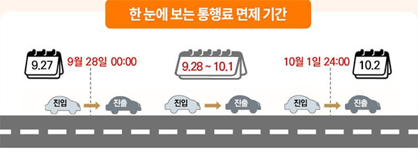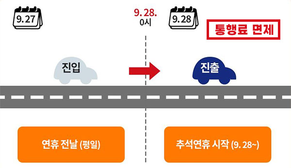 예) 9월 27일 23시에 고속도로 진입하여 28일 1시에 진출하면 고속도로비 면제