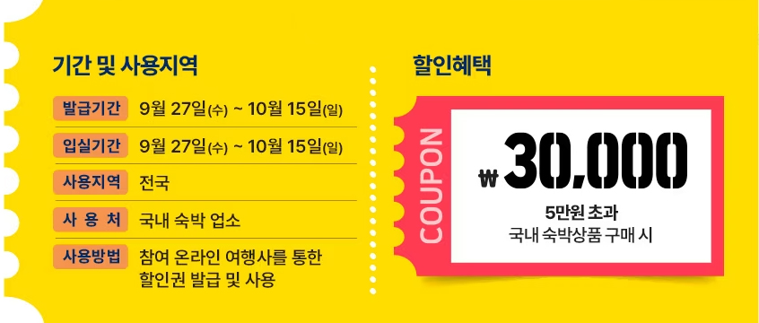이 기간 동안 5만원 이상 숙박 시설 이용 시 3만원을 할인받을 수 있는 쿠폰을 제공합니다
