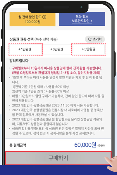 4. 상품권 권종(1만원권, 3만원권, 5만원권) 선택 후 구매
