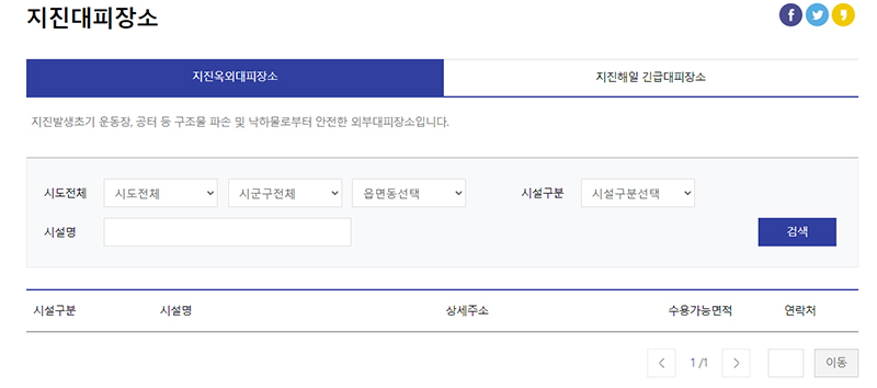 국민재난안전포털에서 '지진 옥외대피 장소' 및 '지진해일 긴급대피장소'를 검색해 보세요