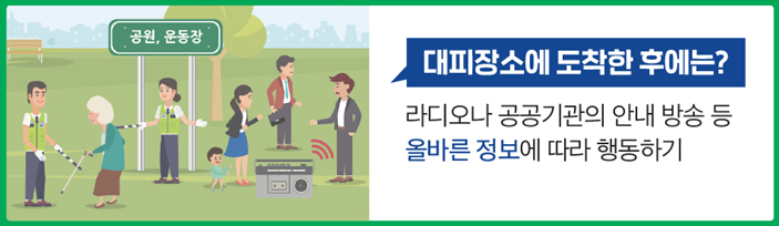 라디오나 공공기관의 안내 방송 등 올바른 정보에 따라 행동합니다